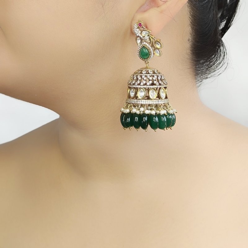 This stunning jhumka earring features an intricate peacock design, crafted with the finest uncut CZ Polki stones. Plated in antique gold with black Polki accents, it is further adorned with delicate pearls and vibrant green pota stones, offering a timeless blend of elegance and traditional charm. Perfect for any occasion.
