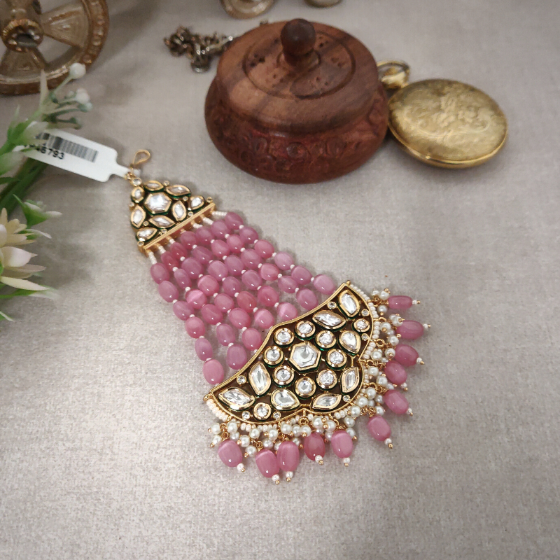 Shreya Passa is made of exceptional quality kundan, adorned with baby pink beads and embellished with an array of small oval pink beads.