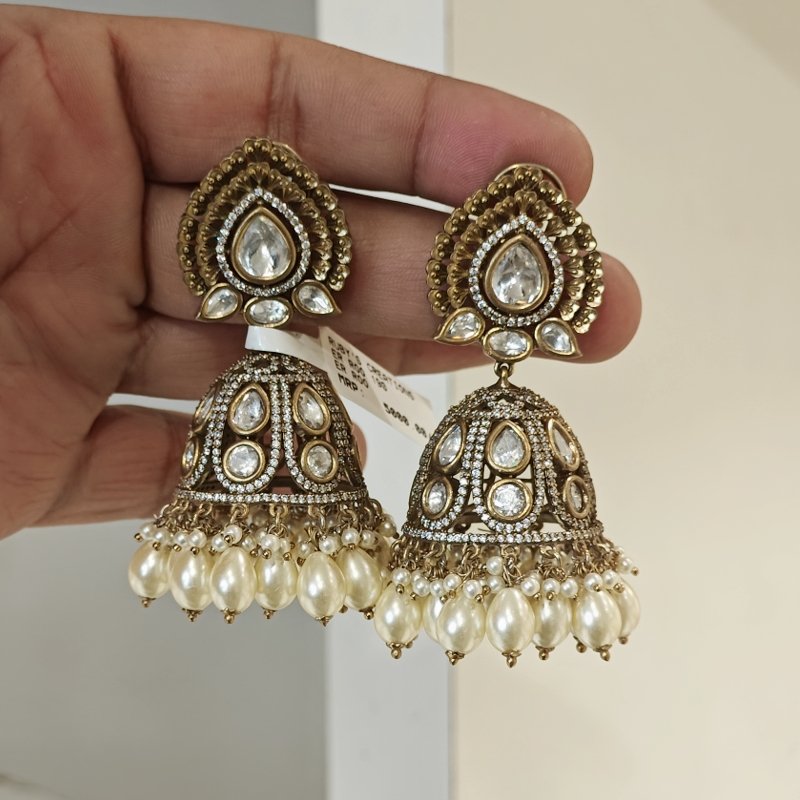 Kalpana jhumkas are made in finest quality uncut polki which is real replica of diamond polki stones .Metal used is silver mixed metal alloy and plated in 22 kt antique gold ,beaded in pearls ,these can be customised to any colour of your choice ( subject to availability).