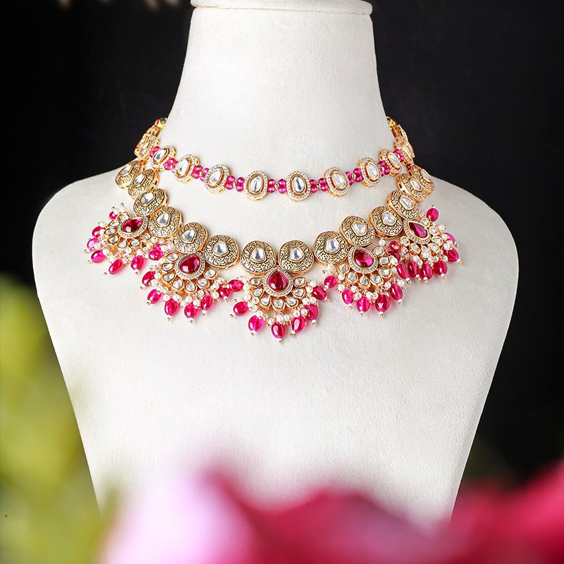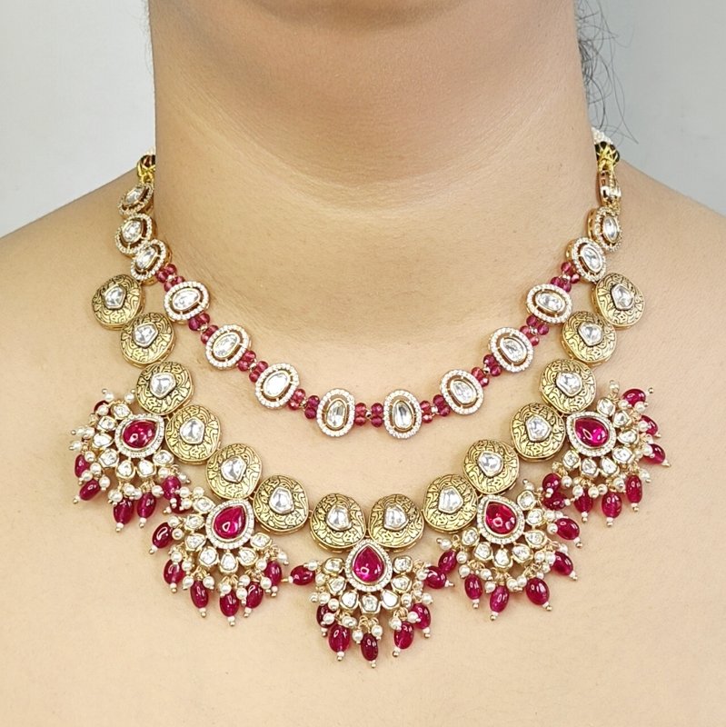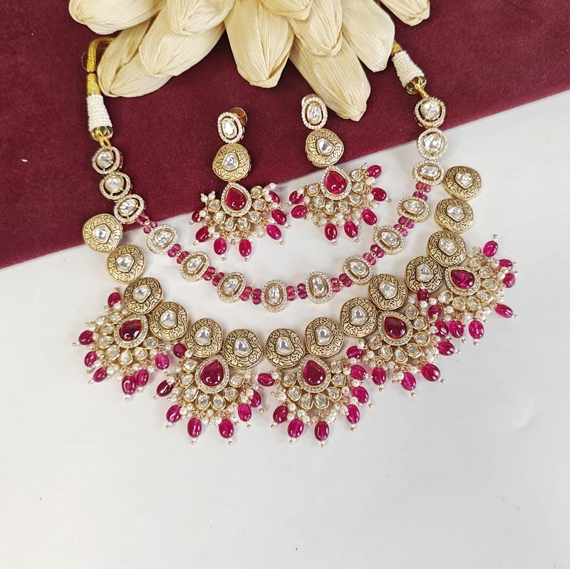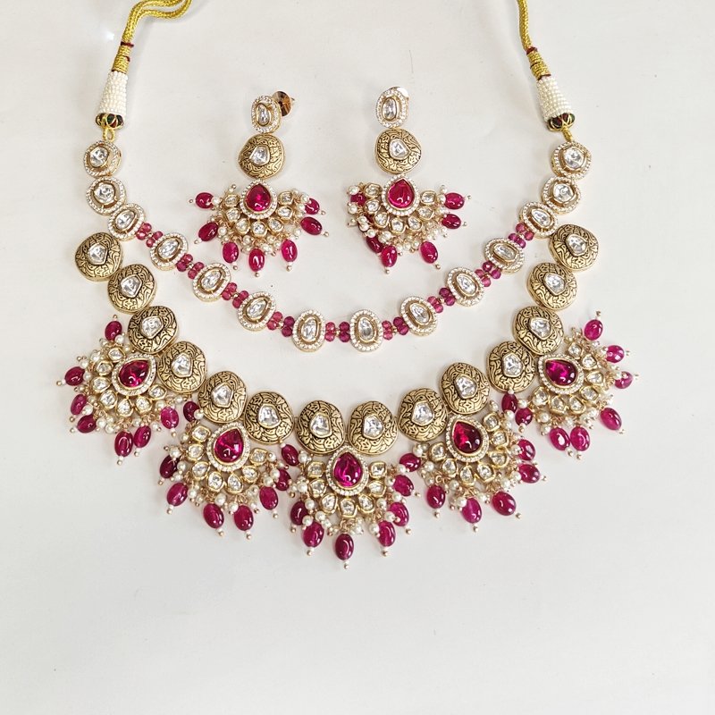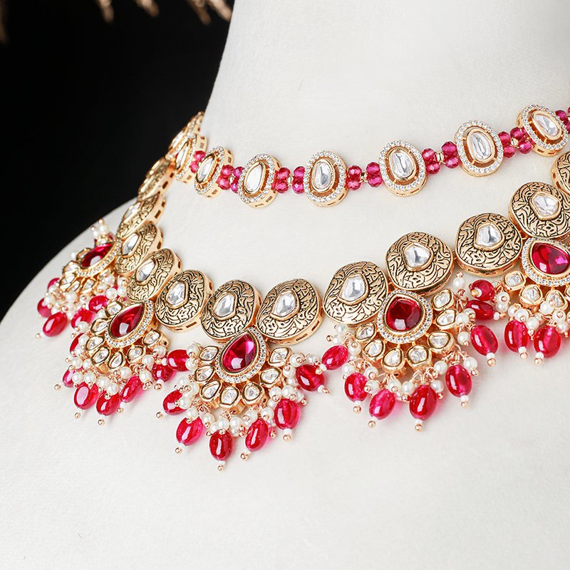 Crafted with a combination of CZ and Polki stones, this vintage-inspired necklace boasts a unique design that's sure to turn heads. The necklace and accompanying earrings are embellished with wine-shaded hydro beads, adding a touch of elegance and sophistication to any ensemble.