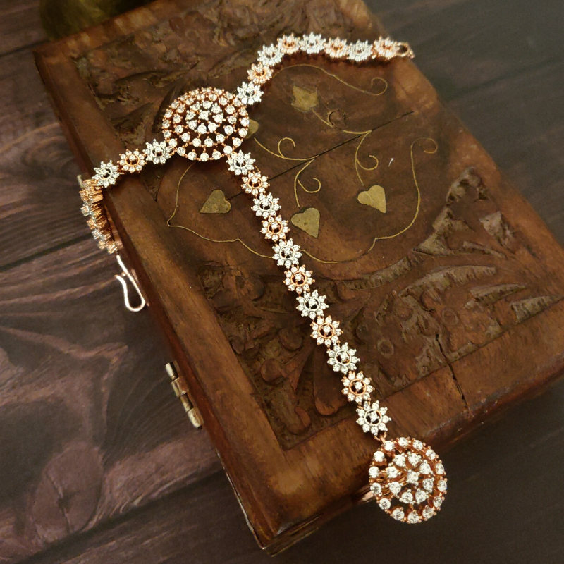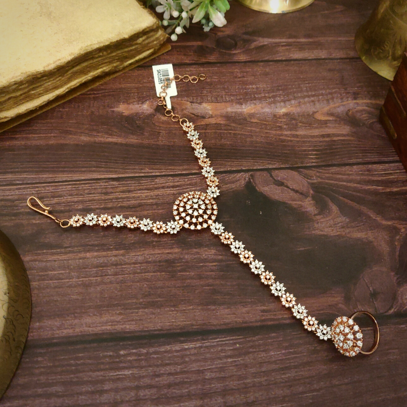 Crafted in A.D with intricate stone detailing and finished with a radiant white rhodium polish, this Indo Western hathphool is designed to adorn a single hand with elegance.