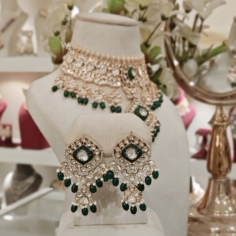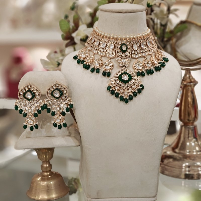 This stunning 22 kt gold plated bridal choker set is crafted with artificial polkies and embellished with exquisite emerald green semi-precious beads. The center pendent is exquisitely designed to add a touch of glamour to your bridal look on your special day.