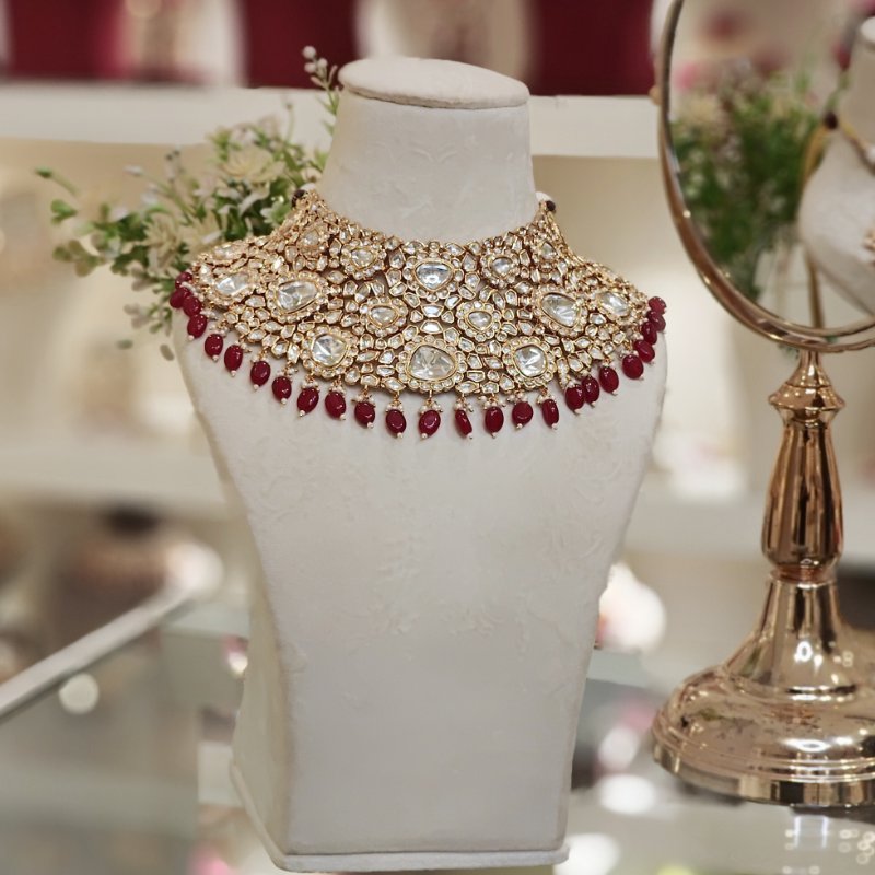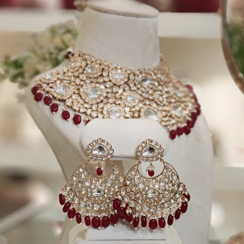 Crafted with luxurious materials, this bridal necklace set boasts an elegant chandbali design that glimmers with 18 kt gold plating. The pendant is adorned with artificial polkies of finest quality and completed with stunning red ruby beads, making it a captivating piece for any special occasion. can be customised to any colour of your choice