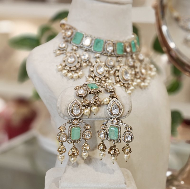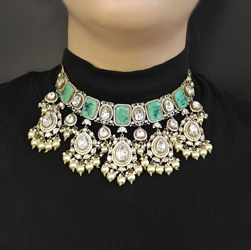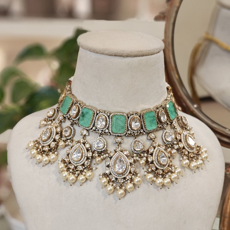 This exquisite bridal necklace set is a true masterpiece, studded with uncut CZ Polki stones, green pota stone and sparkling cubic zirconia. Plated with antique victorian plating , it exudes timeless elegance and luxury, making it the perfect choice for brides seeking a blend of traditional charm and contemporary brilliance.