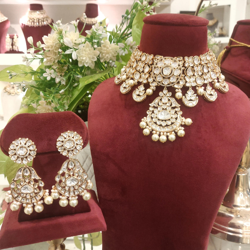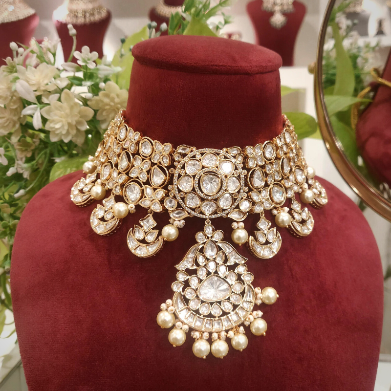 This beautiful Ketki bridal choker set is crafted with care using artificial polkies and embellished with stunning pearls for a glamorous look on your special day.