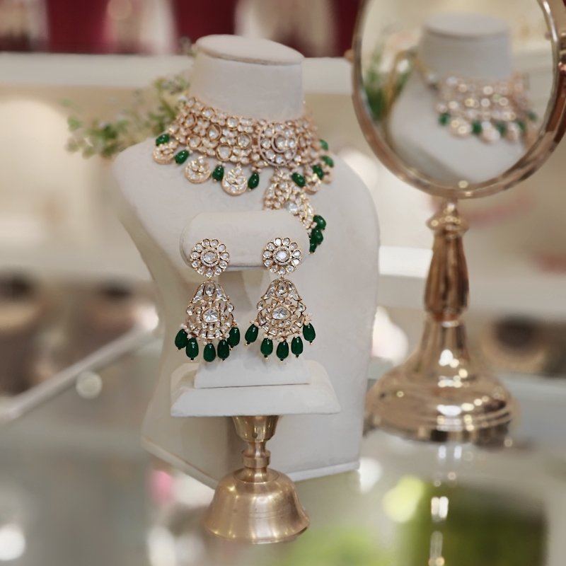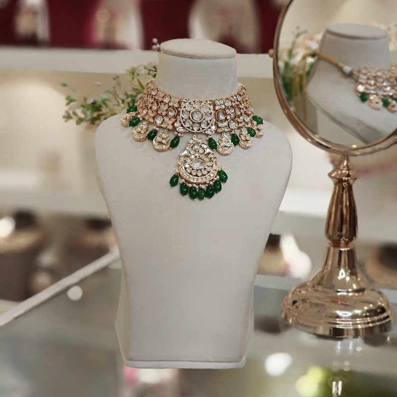 This beautiful Ketki bridal choker set is crafted with care using artificial polkies and embellished with stunning emerald green semi-precious beads for a glamorous look on your special day.