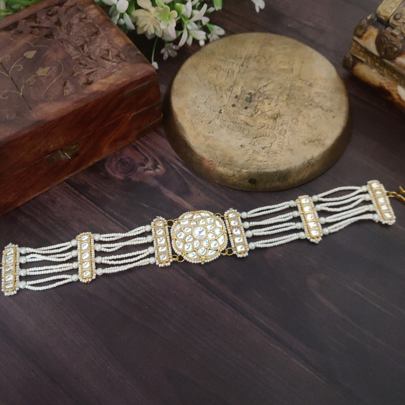 Paachi kundan sheeshpatti plated in 22 kt gold and beaded with micro pearls with kundan connector.