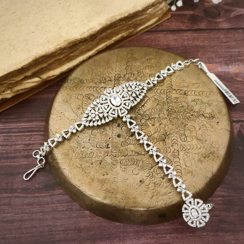 Crafted in A.D with intricate stone detailing and finished with a radiant white rhodium polish, this Indo Western hathphool is designed to adorn a single hand with elegance.
