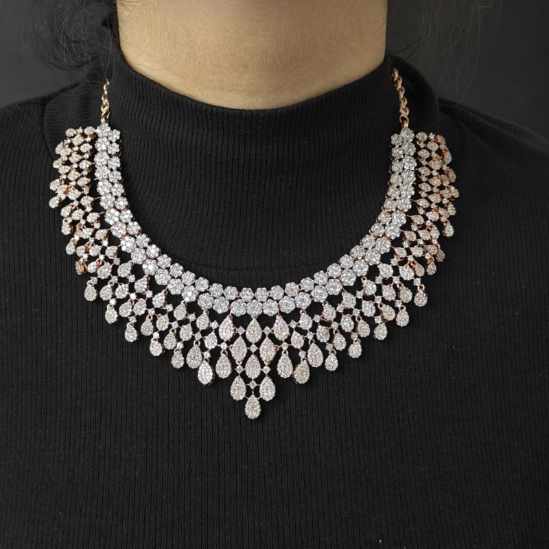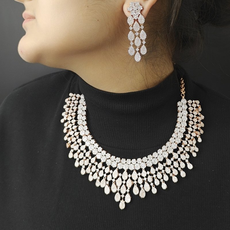 This exquisite piece of jewelry features a beautiful combination of CZ stone with mix of Rose gold and white Perfect for an evening reception .