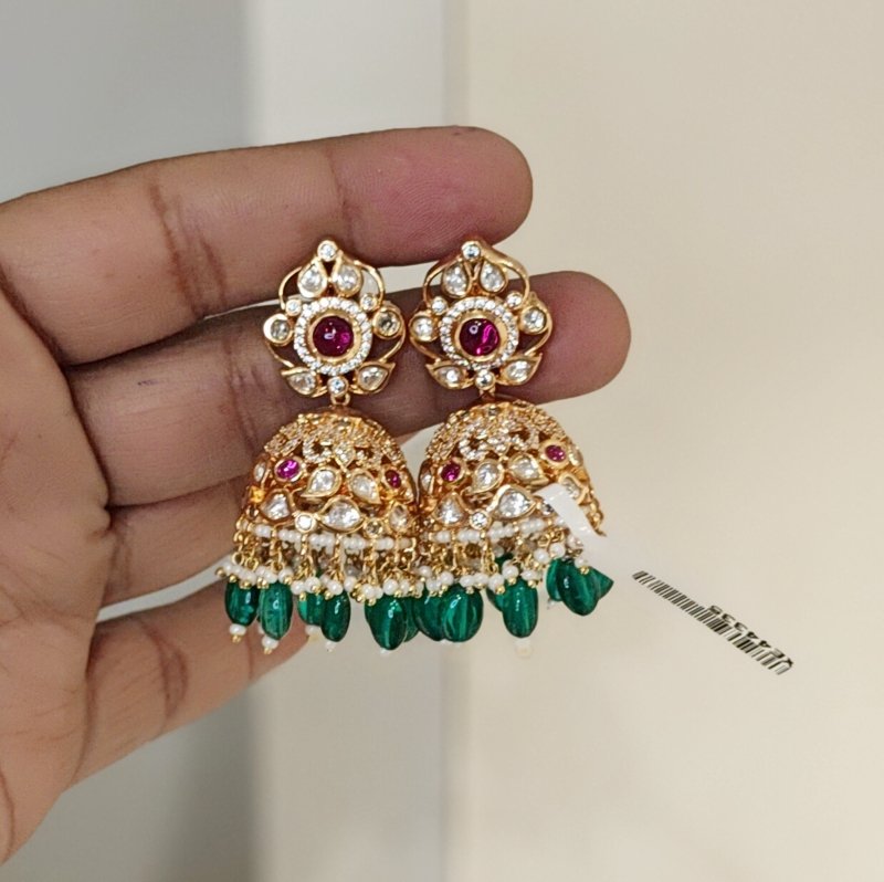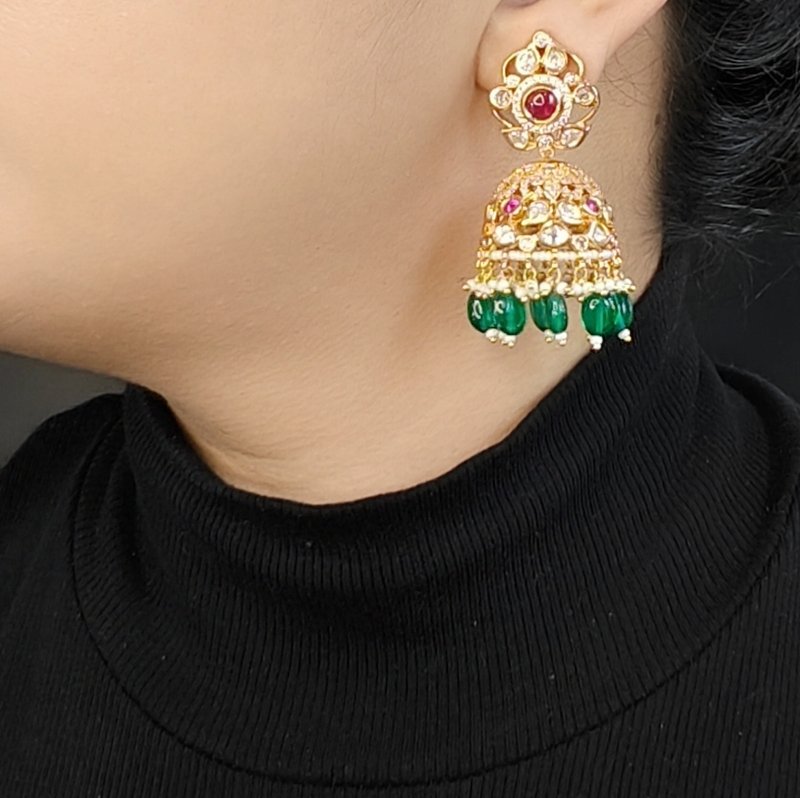These elegant jhumkas are crafted with uncut CZ Polki stones and beautifully beaded with emerald green coloured beads with pearls . Plated in 22 kt gold colour, they combine traditional craftsmanship with a touch of modern flair, perfect for adding a regal finish to any look.