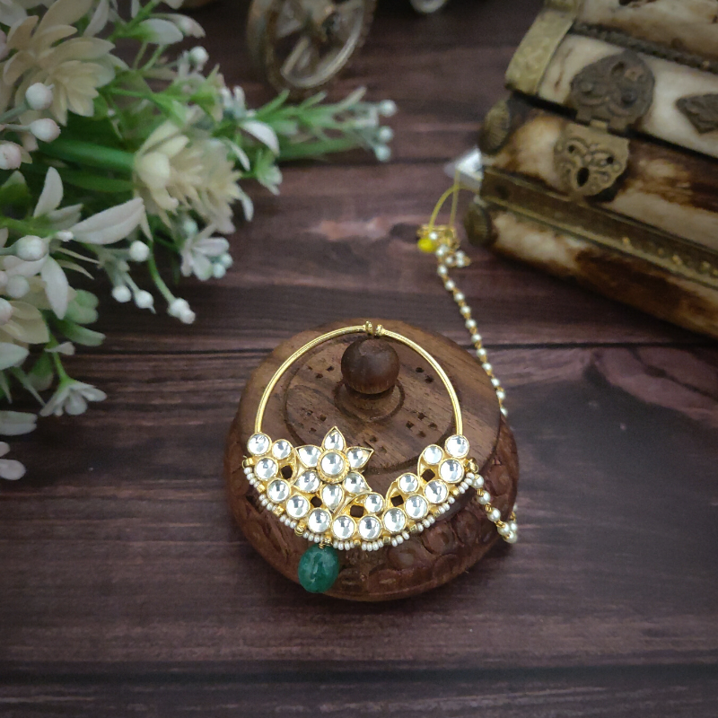22 kt Gold Plated Kiran Nath, made in Ahmedabadi Paachi kundan and beaded with Green bead with pearl chain .This Nath is for Non Pierced Nose.