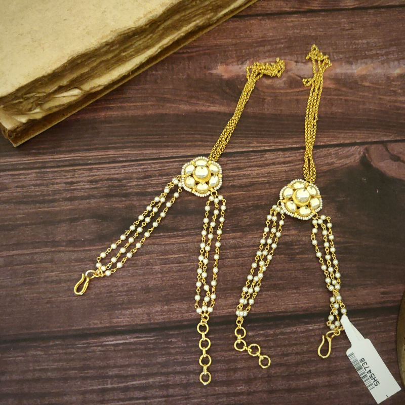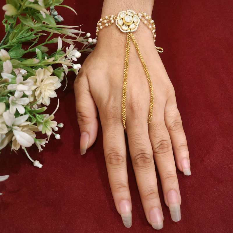 Crafted from Kundan and complete with adjustable pearl chains, this bracelet is not only lightweight but also exudes a sense of elegance.