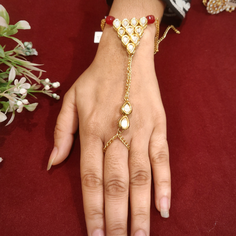 Crafted from Kundan and complete with adjustable gold-plated chains, this bracelet is not only lightweight but also exudes a sense of elegance. This is for single hand only
