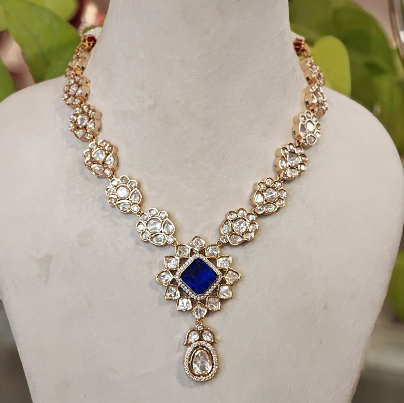 An elegant pendant set featuring matching earrings, crafted with royal blue stones and embellished with uncut CZ Polki. This beautiful set exudes sophistication and adds a touch of timeless charm to any outfit.