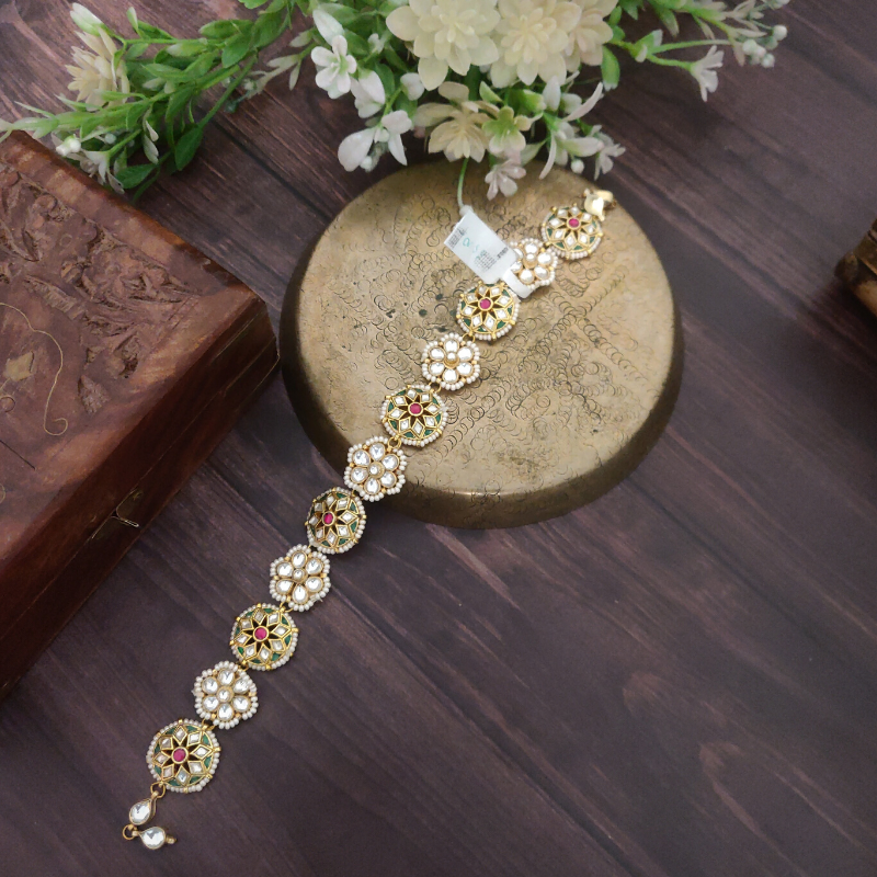 A sheeshpatti draped in colorful kundan and adorned with white pearls, all coated in 22 kt gold.