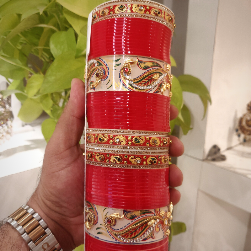 A set of bridal bangles, consisting of red bangles paired with CZ and Nihaar bangles, will adorn both hands of the bride, designed in peacock style .