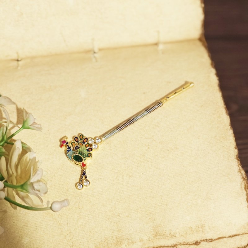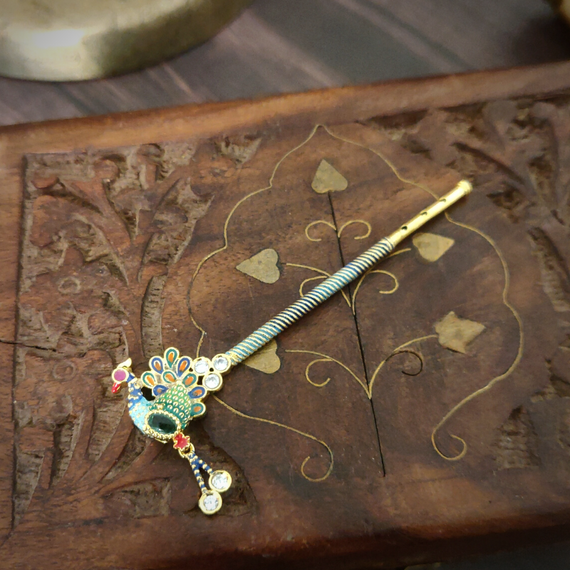 Crafted from artificial polki, this exquisite peacock bansuri is adorned with intricate meena work in multicolour.