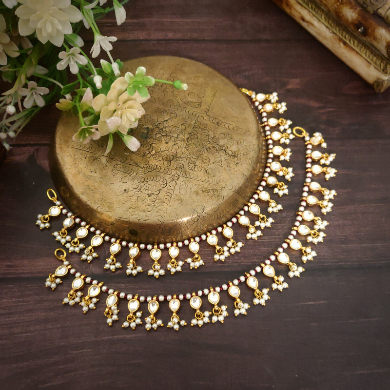 White and maroon beads are strung together to create a beautiful kundan payal adorned with pear-shaped kundan saru pieces.