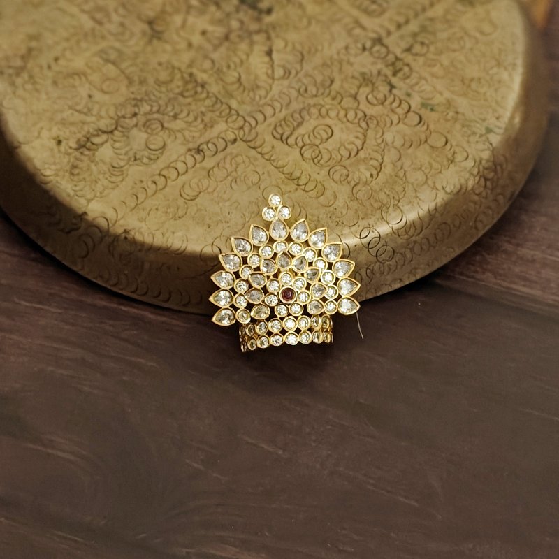 Meticulously crafted with ruby-colored stone and zirconia, , the Diety Mukut emits a divine aura. It is coated with 22 kt gold, adding to its radiance.