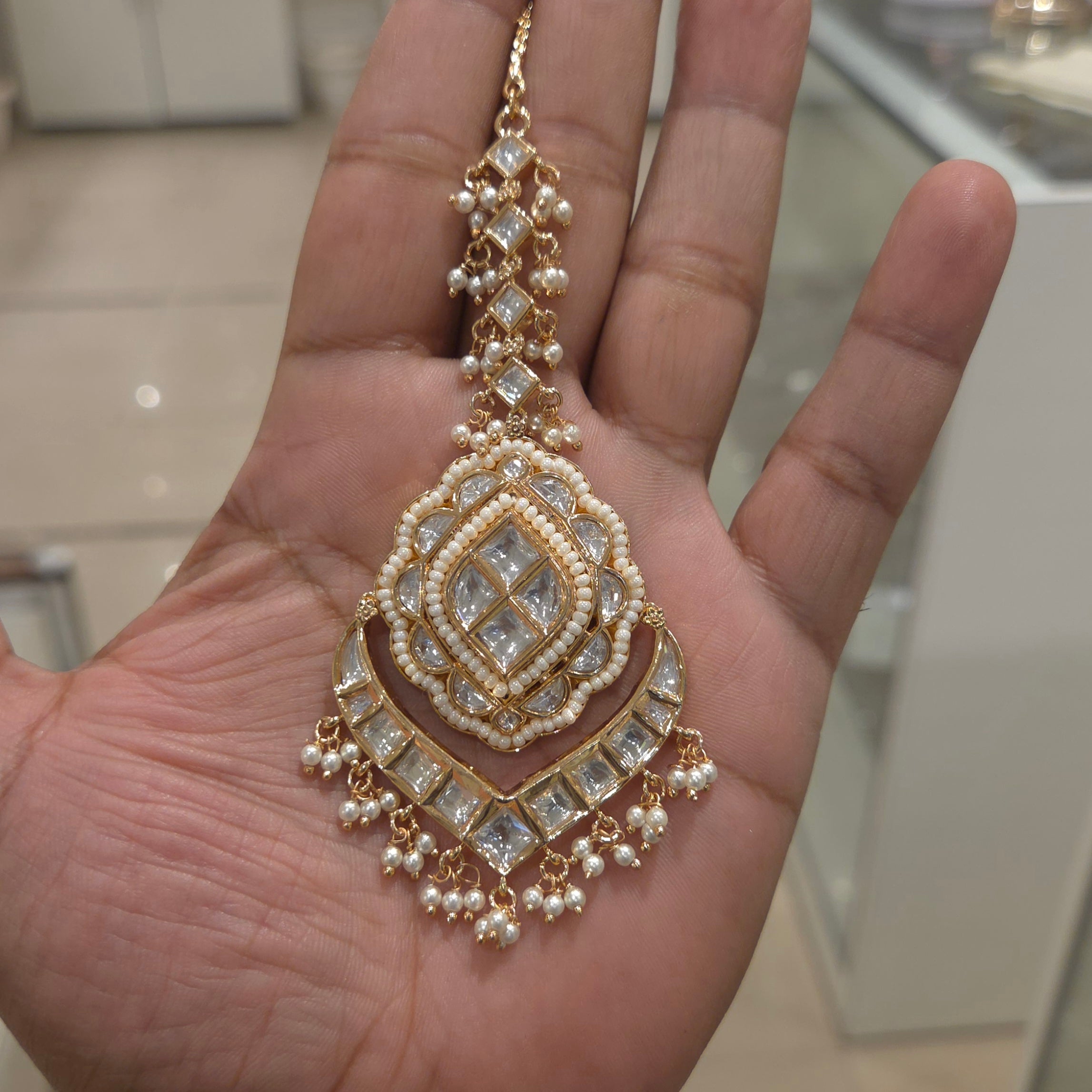 This medium-sized maangtikka is a beautiful addition to any collection. Made with CZ uncut polki and plated with 18 kt gold, this piece will add a touch of elegance to any outfit. Accented with off white pearls, this maangtikka is the perfect combination of traditional and modern design.