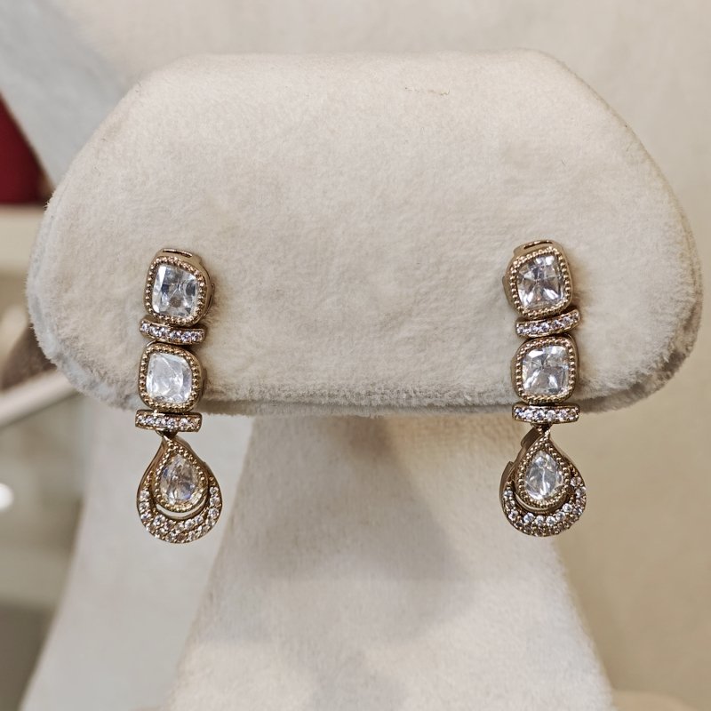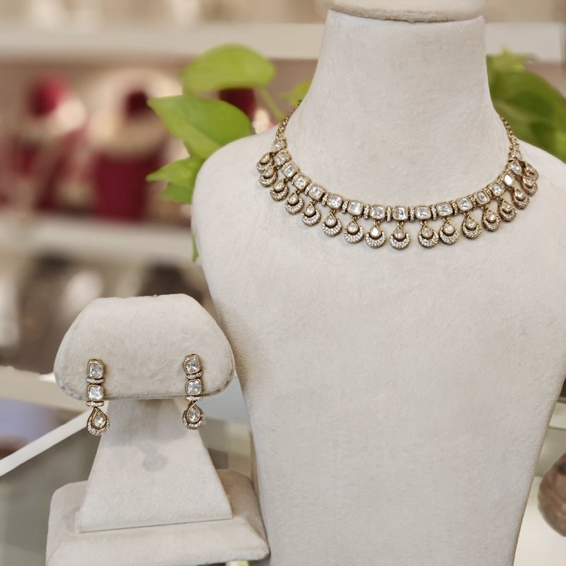 A stunning single-line necklace set crafted with Moissanite Polki and CZ stones, elegantly plated in antique Victorian polish. This exquisite set adds a touch of classic beauty to any ensemble.