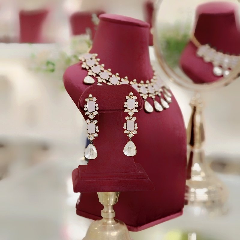 A stunning indo-western set with pink emerald-shaped stones and large single polki stones, plated with black and gold rhodium. A gorgeous accessory to elevate any outfit.