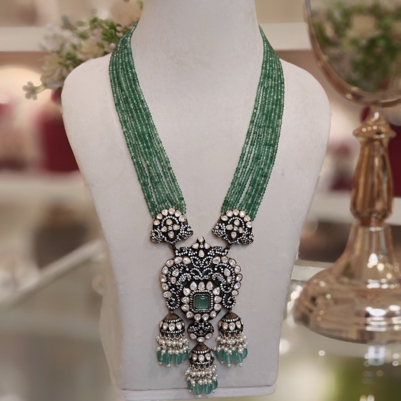 The Manasvi set features mint green beads and white pearls crafted with cz and moissanite polki stones . Along with the striking design, the set comprises of Jhumka-style earrings that hang gracefully from the earlobe. The finishing touch to this stunning set has been given by plating it in mehandi gold plating .\n\n.