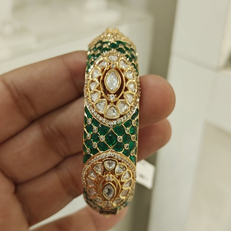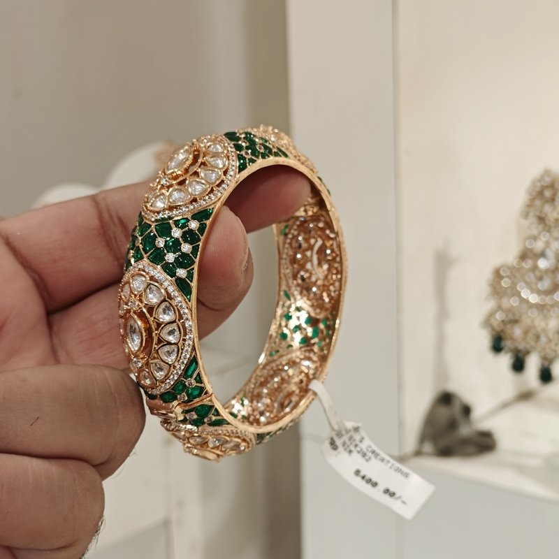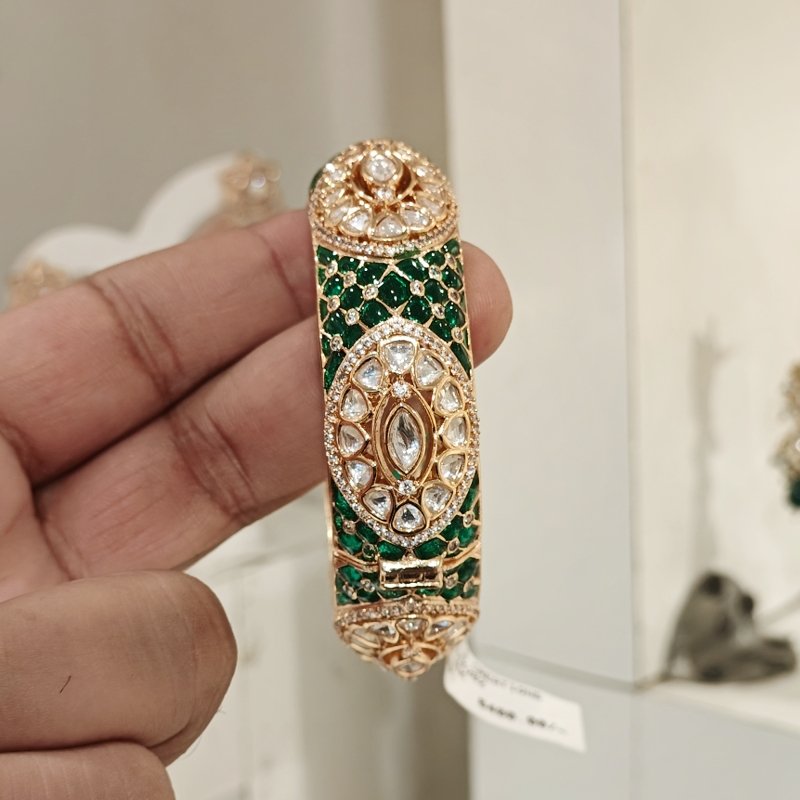 Megha bangles are crafted in silver mixed metal alloy and studded with uncut lab grown polki stones with cz and emerald green pota stones .these are openable bangles so it can fit most of the sizes .