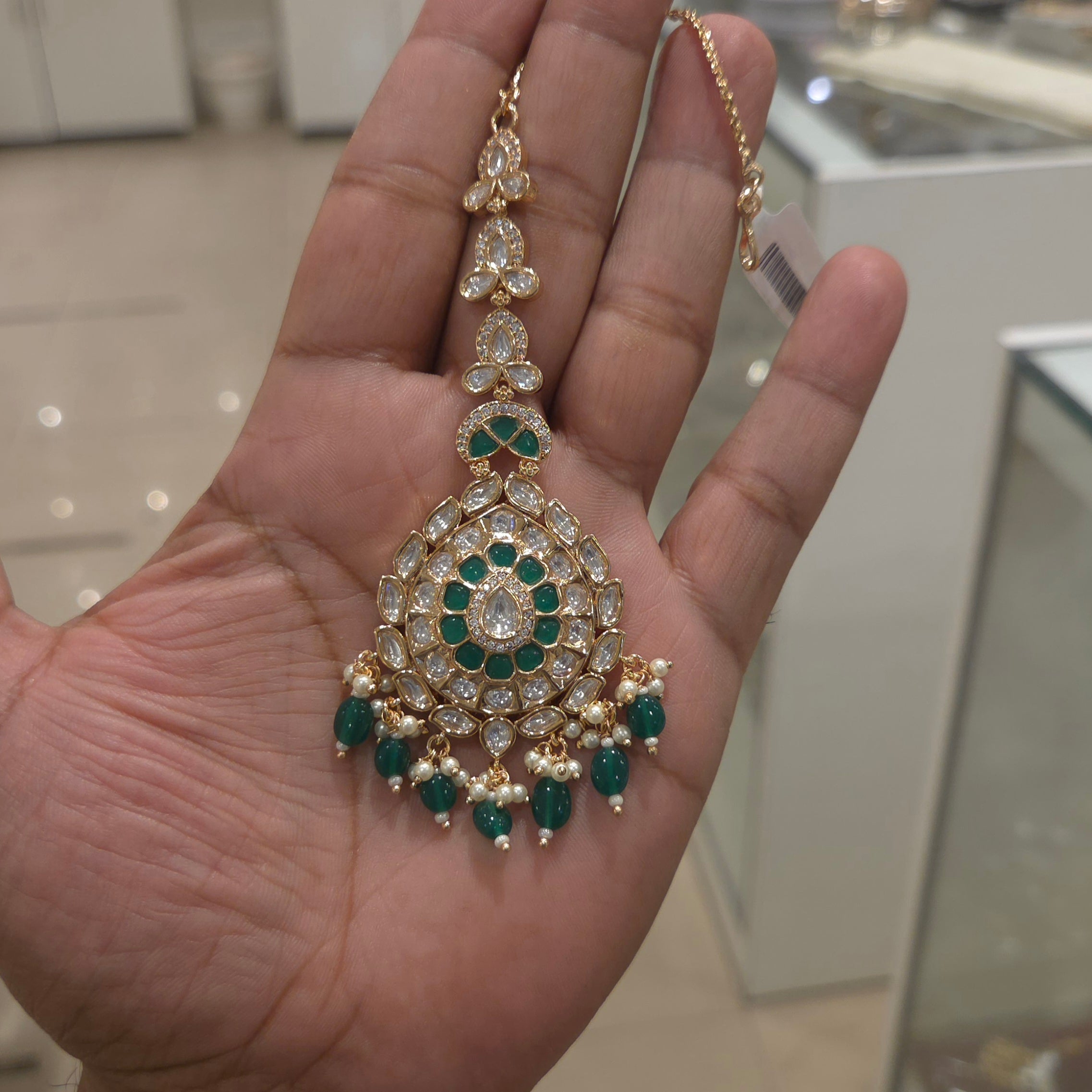 This elegant and expertly crafted Manvi Polki Maangtikka features medium-sized uncut cz polki gemstones and is plated with 18 kt gold. The intricate design is adorned with beaded emerald green accents, adding a touch of sophistication to any look. Expertly designed and sure to impress.