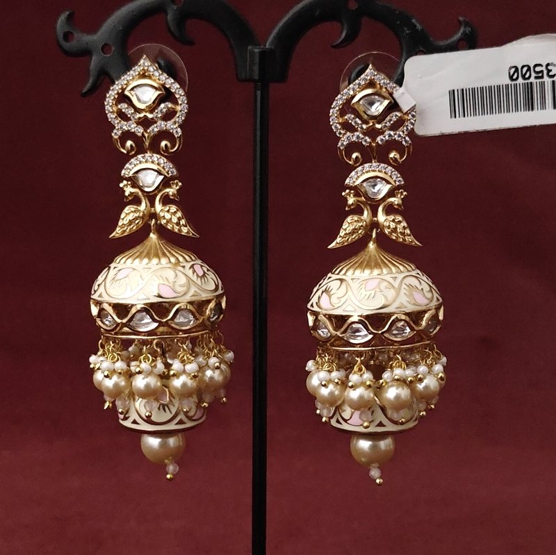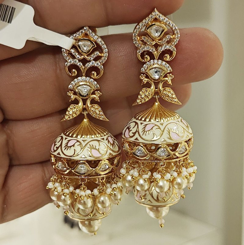 Maria enameled jhumkas are handcrafted with white and pink enameled work. created from uncut lab produced polki that has been plated in 18 carat gold