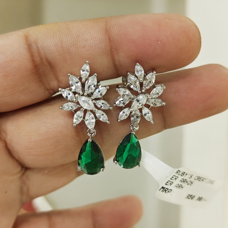 This stunning white rhodium earrings consist of marquise shaped CZ stone with tear drop shaped emerald green hydro stone hanging at the bottom.