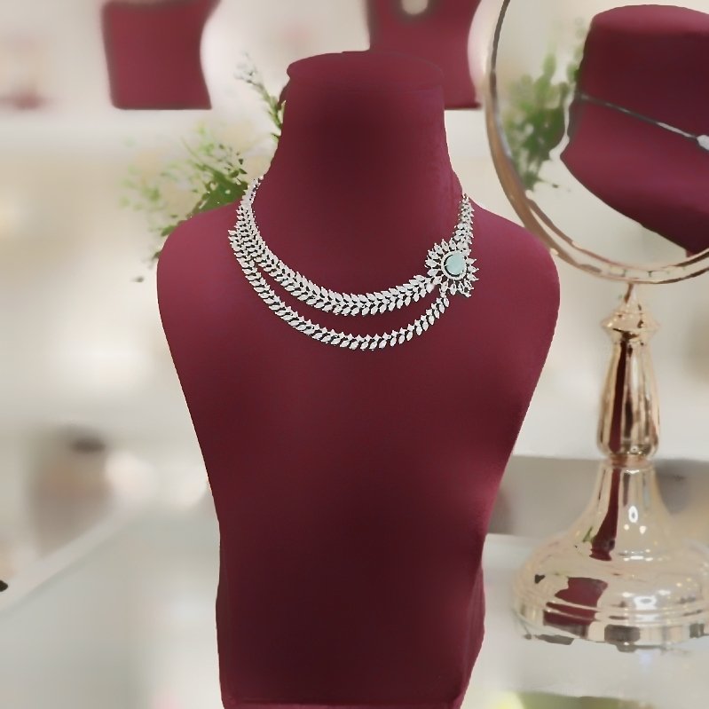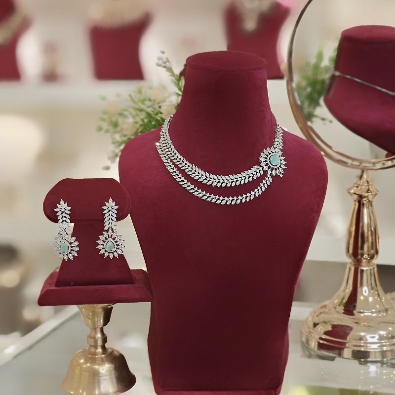 This elegant necklace set features a brouch design with a double line of sparkling CZ and a gorgeous mint green stone, all plated with stunning white rhodium.