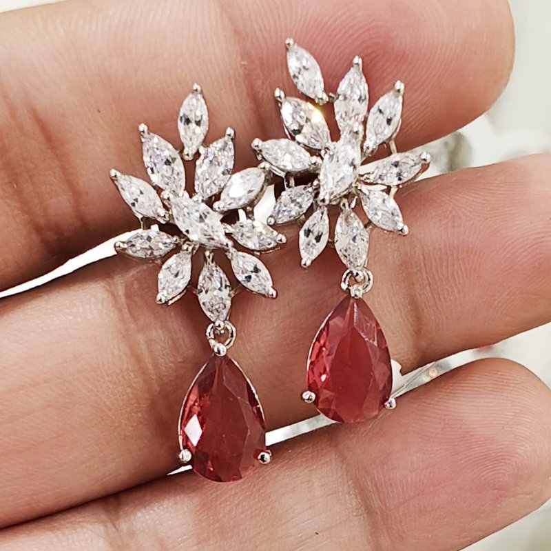 This stunning white rhodium earrings consist of marquise shaped CZ stone with tear drop shaped ruby red hydro stone hanging at the bottom.