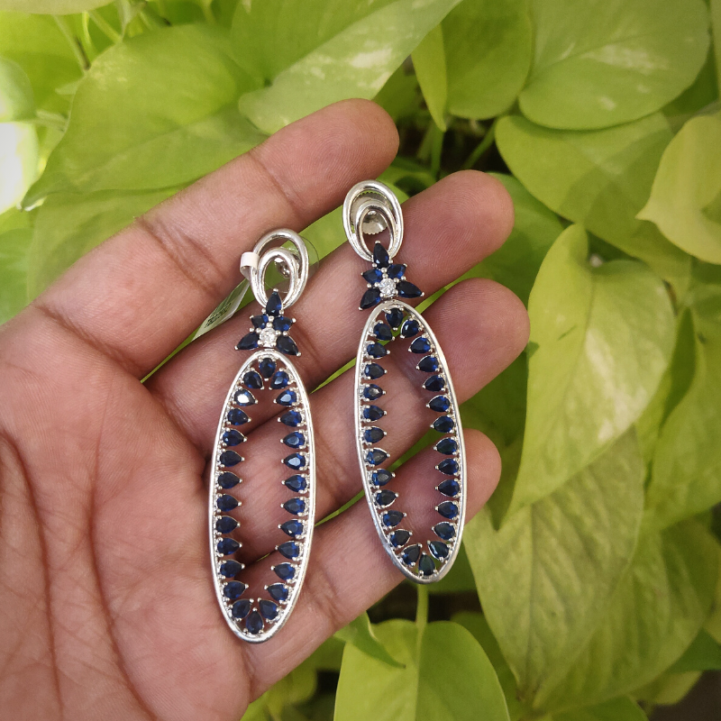 Elongated shark-shaped earrings consisting of zirconia and embellished with Royal blue gemstones.