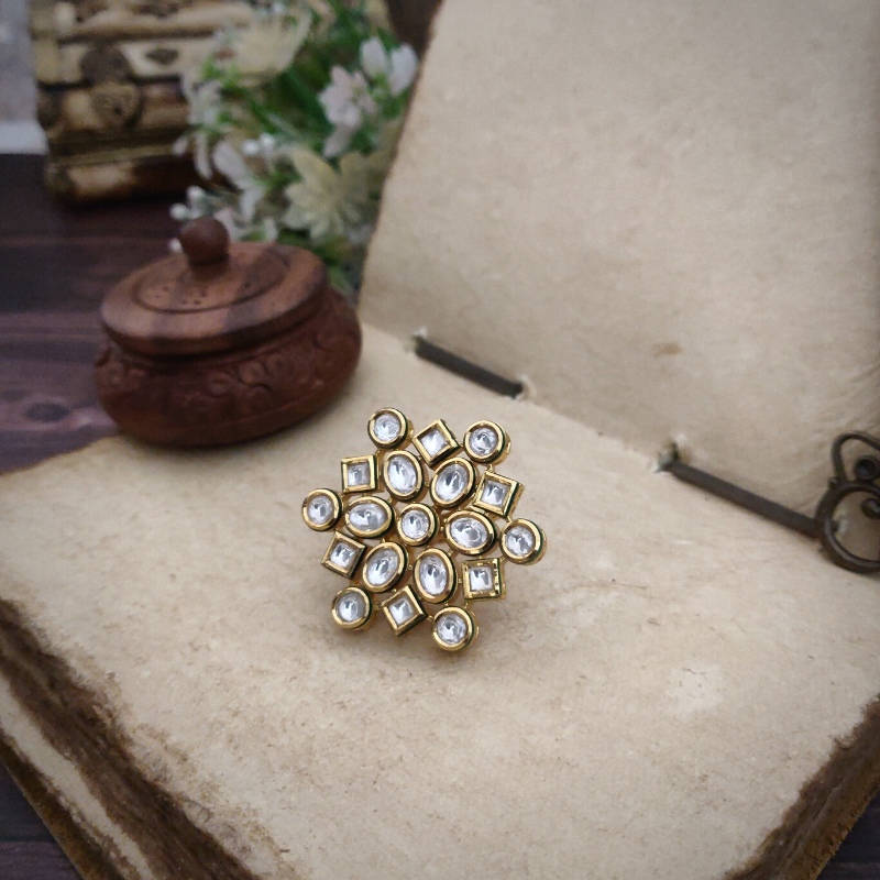 The Maya Ring is made in Kundan work and plated in 22 Kt Gold . It is designed adjustable to accommodate most sizes.