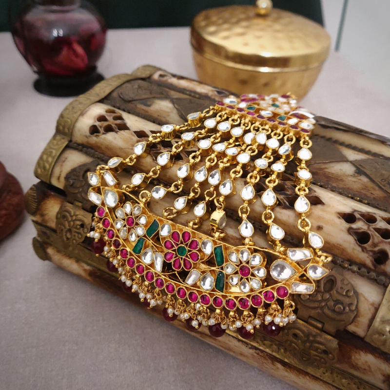 The exquisite meena passa has been intricately designed with vividly hued paachi kundan and adorned with smooth, round maroon beads. Its luxurious appearance is further enhanced by its regal 22-karat gold plating.