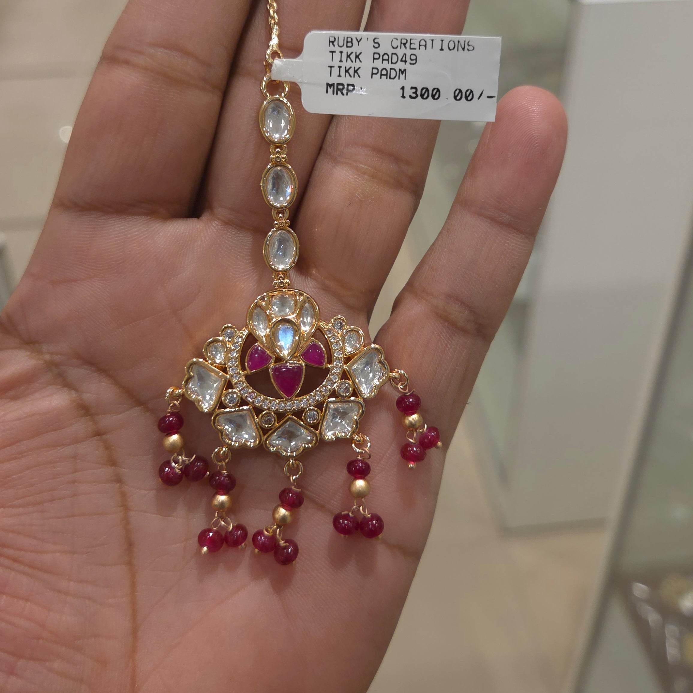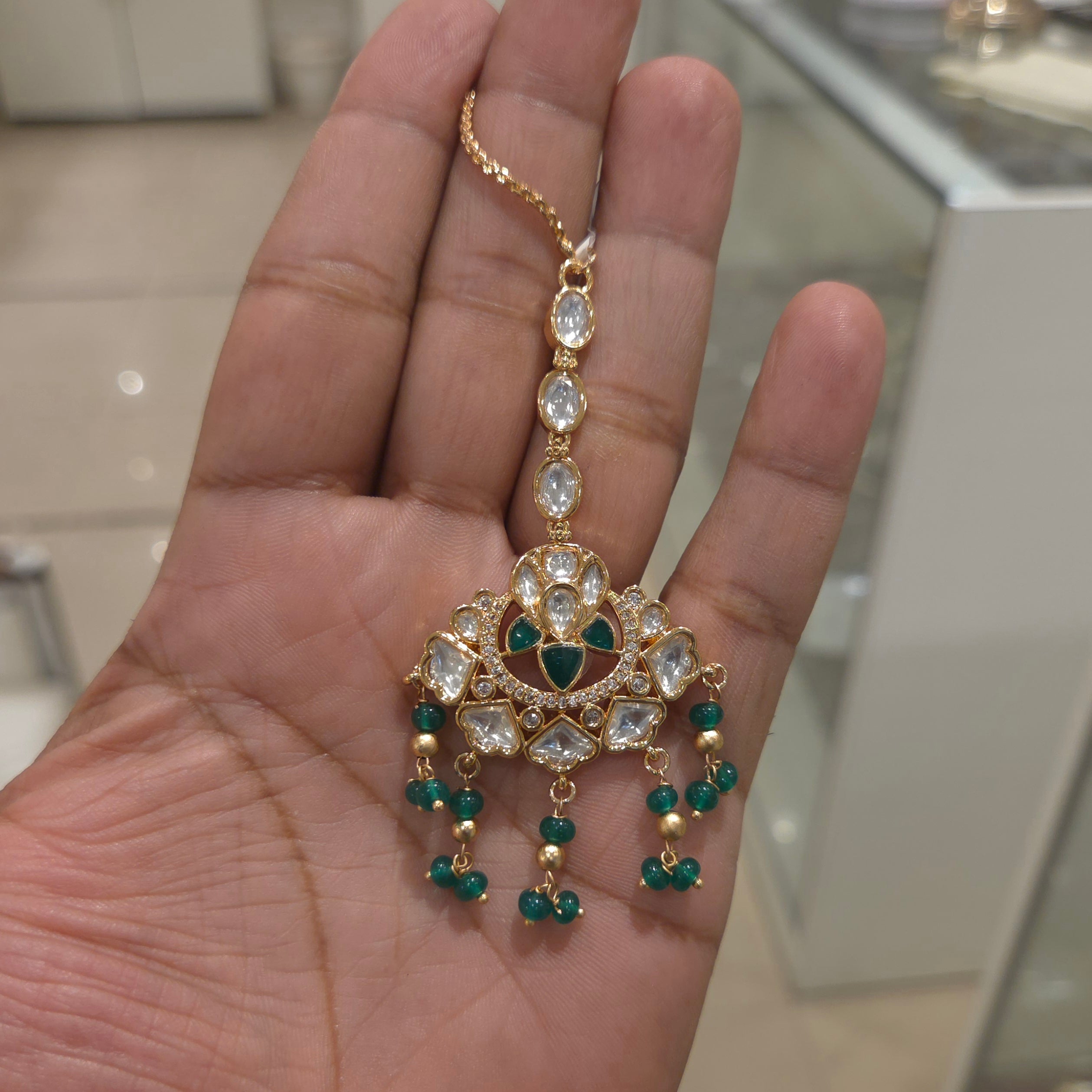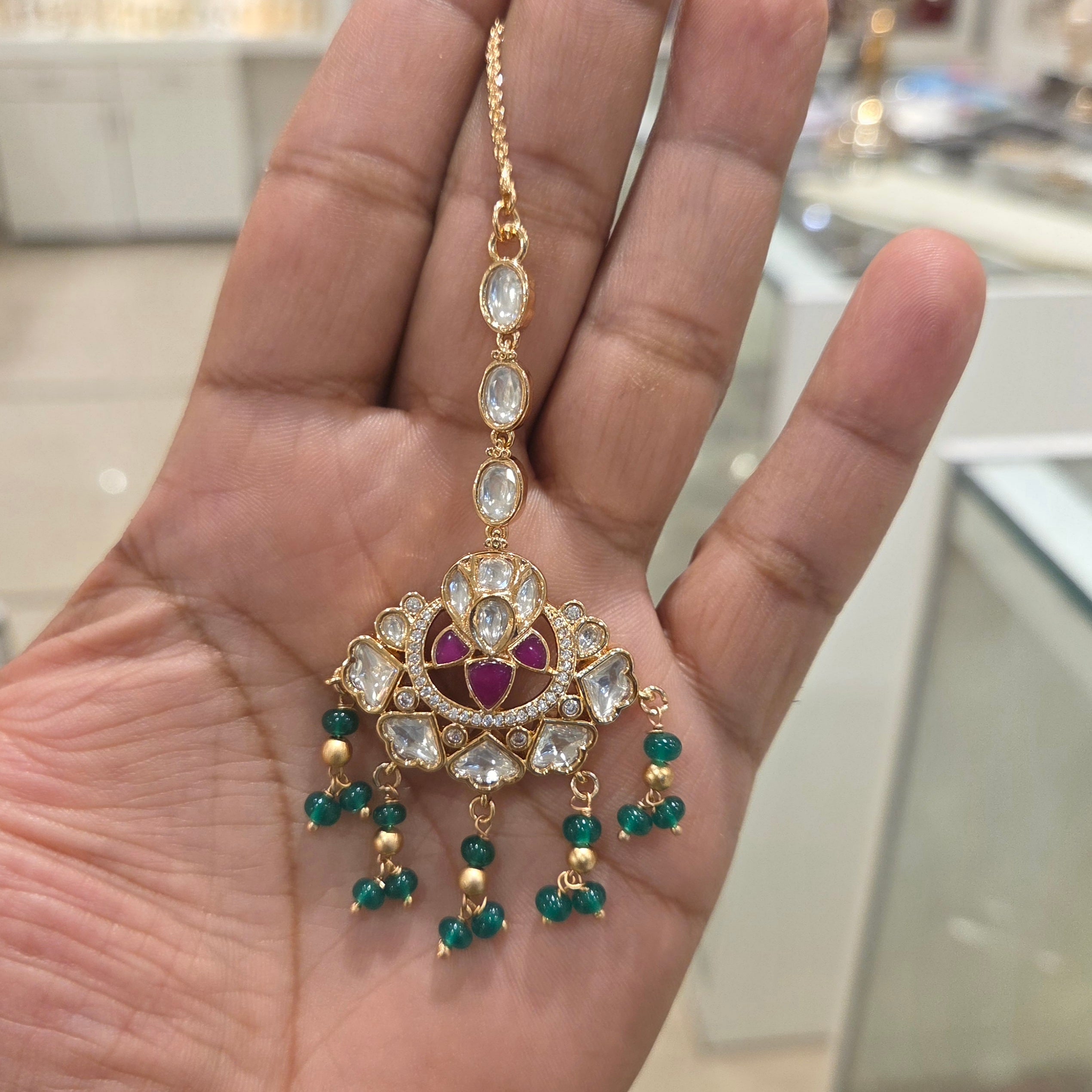 This exquisite tikka showcases a stunning uncut CZ polki centerpiece. It is beautifully adorned with vibrant ruby and green epoxy stones. Delicate green and ruby hydros further enhance its intricate design. The craftsmanship suggests a truly unique and eye-catching piece. This tikka promises to add a touch of regal elegance to any ensemble.