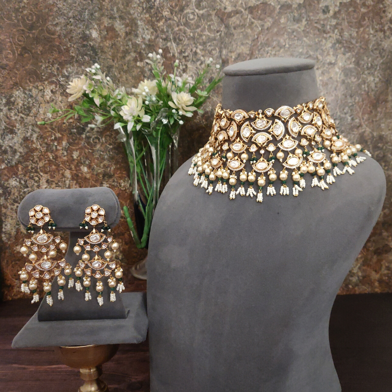 The Meera choker set is meticulously crafted using the finest uncut artificial polki stones, which is then plated with a luxurious 18kt gold hue to add more charm to it. To create this ornate piece of beauty even more special, the necklace is integrated with lovely pearls and green beads that are arranged in a beaded fashion.