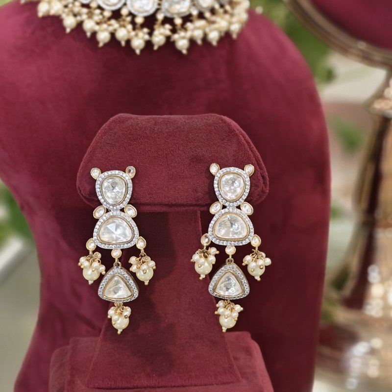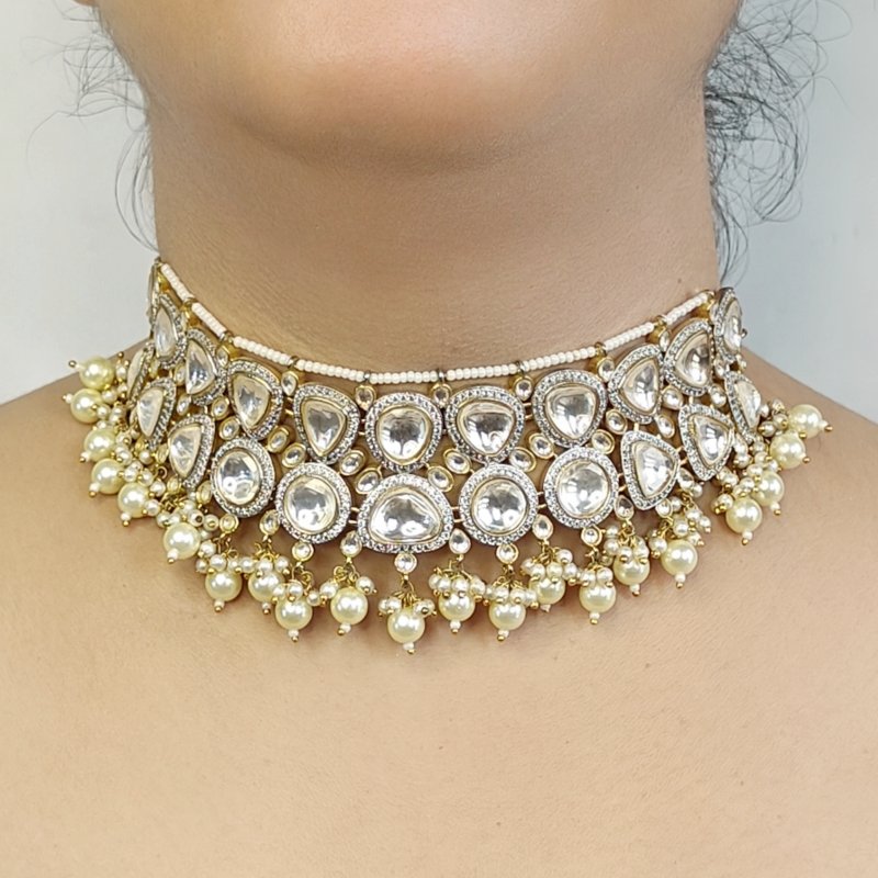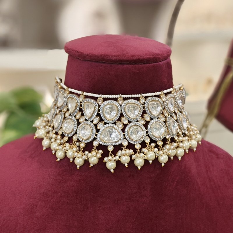 A choker necklace set adorned with uncut polki gems,surrounded by cz stones , featuring pearls beaded at the bottom.