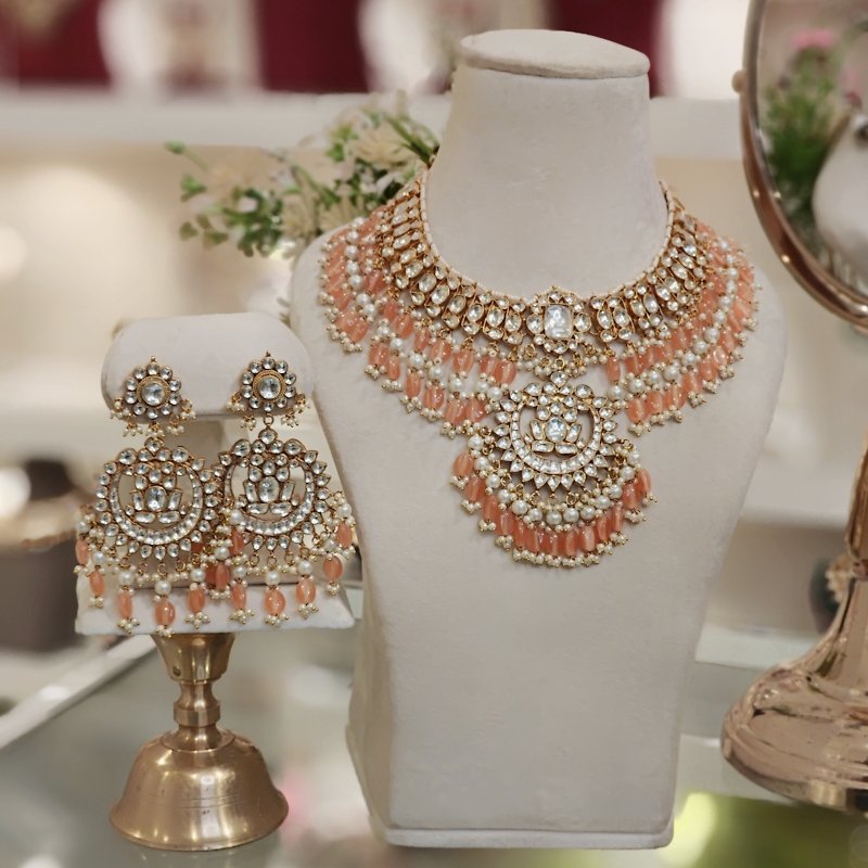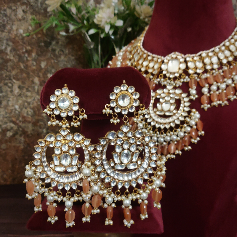 Crafted with exquisite skill, Meeraki kundan set boasts a rich palette of peach hues, with double-layered Monalisa beads and delicate chaandbali earrings. The 22 karat gold plating makes it a timeless addition to any jewelry collection.