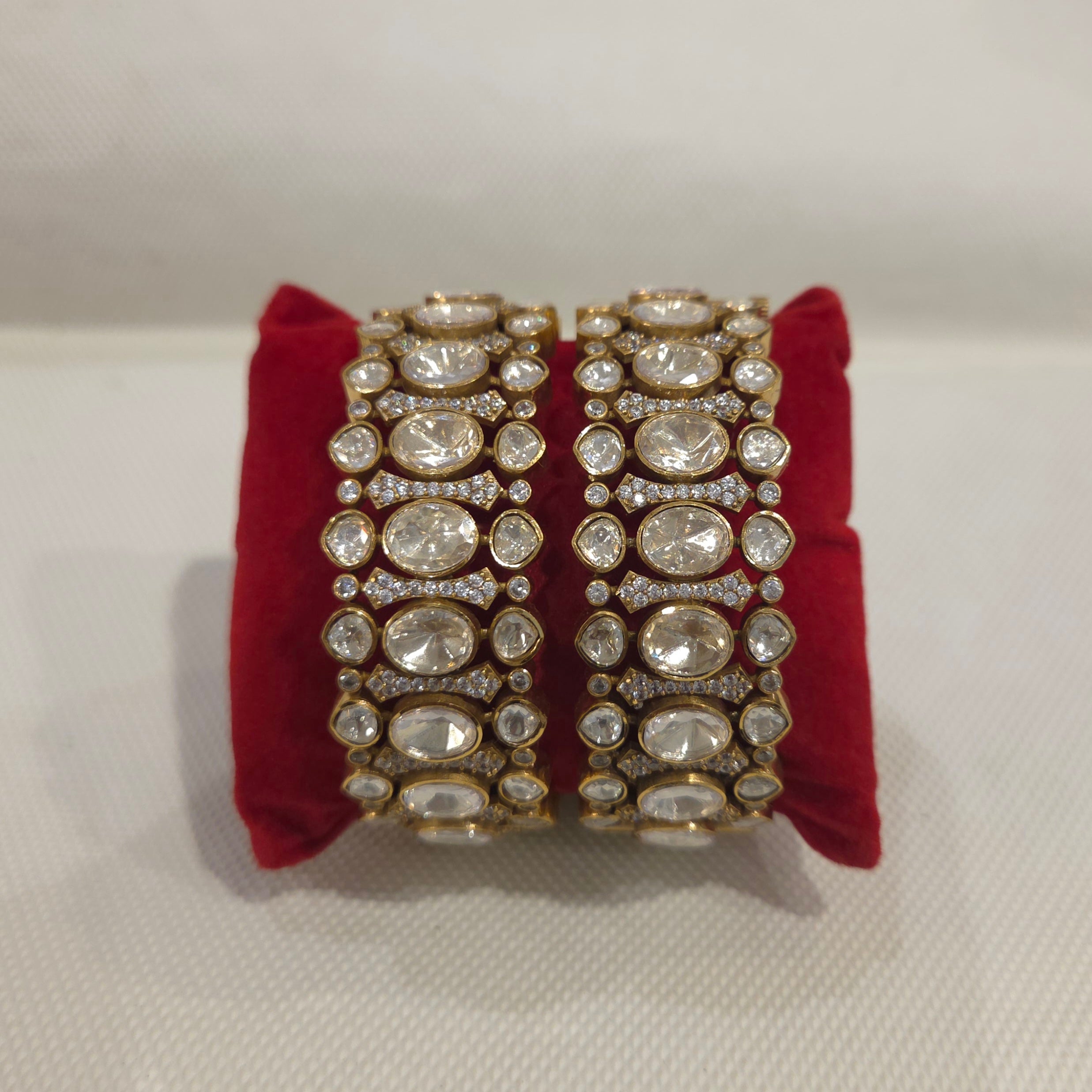 Expertly crafted with brass mixed metal alloy and plated in a stunning dull gold color, the Megha moissanite polki bangle pair offers a bold and elegant statement. Each bangle is adorned with LB top moissanite polki stones for a touch of luxury. These openable bangles are the perfect addition to any outfit.