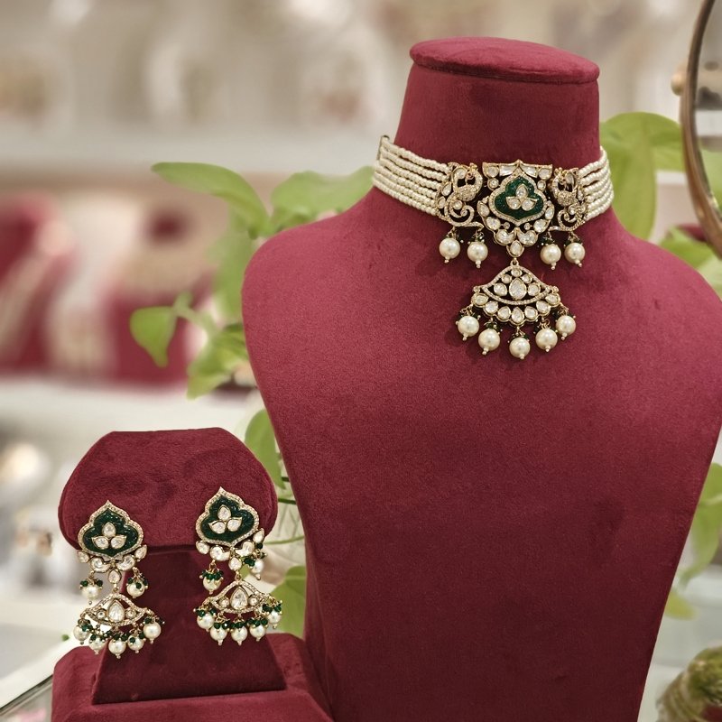 A choker set plated in antique gold polish and crafted in cz and uncut faceted polki stones beaded with green mani and pearls .