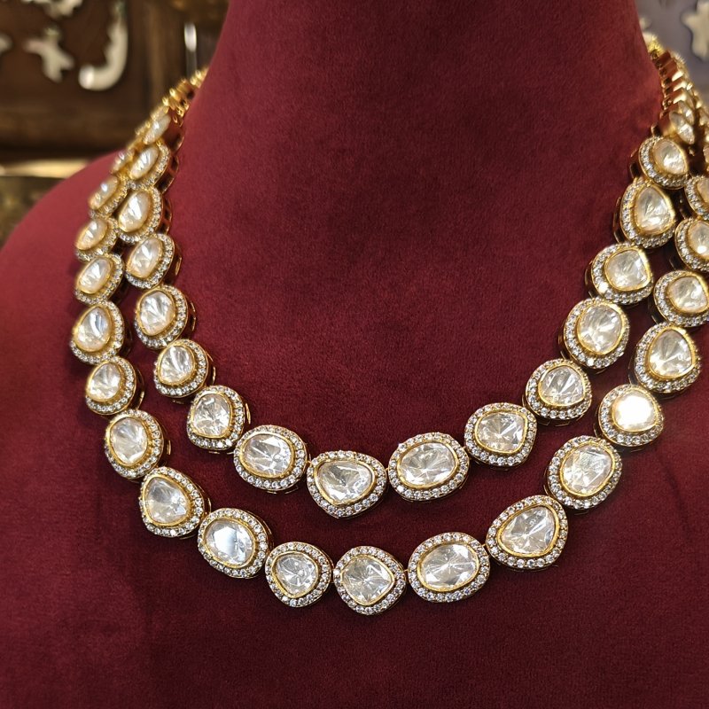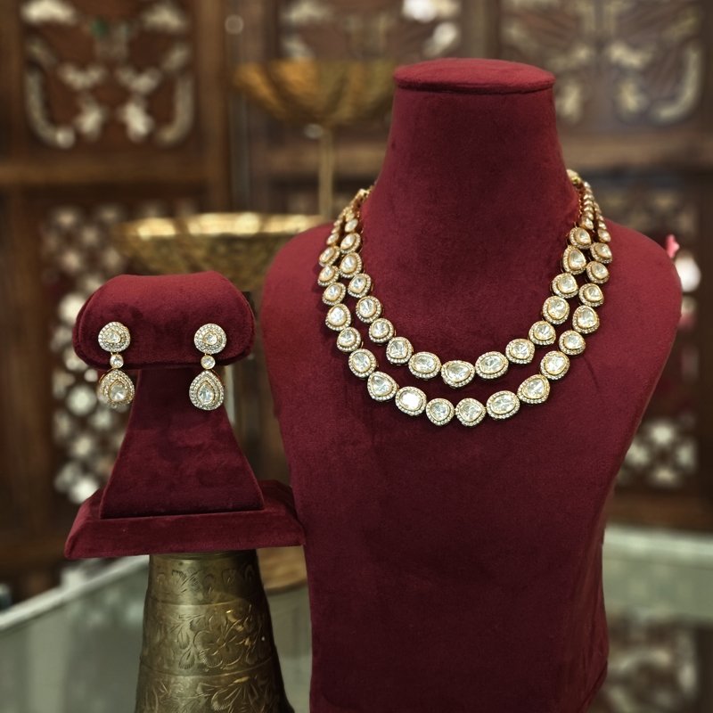 A stunning double-line moissanite gemstone necklace set, beautifully paired with matching earrings. The set is plated in 22kt gold with a delicate mehendi polish, offering an elegant and timeless design perfect for any occasion.