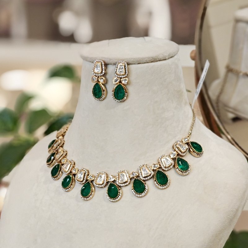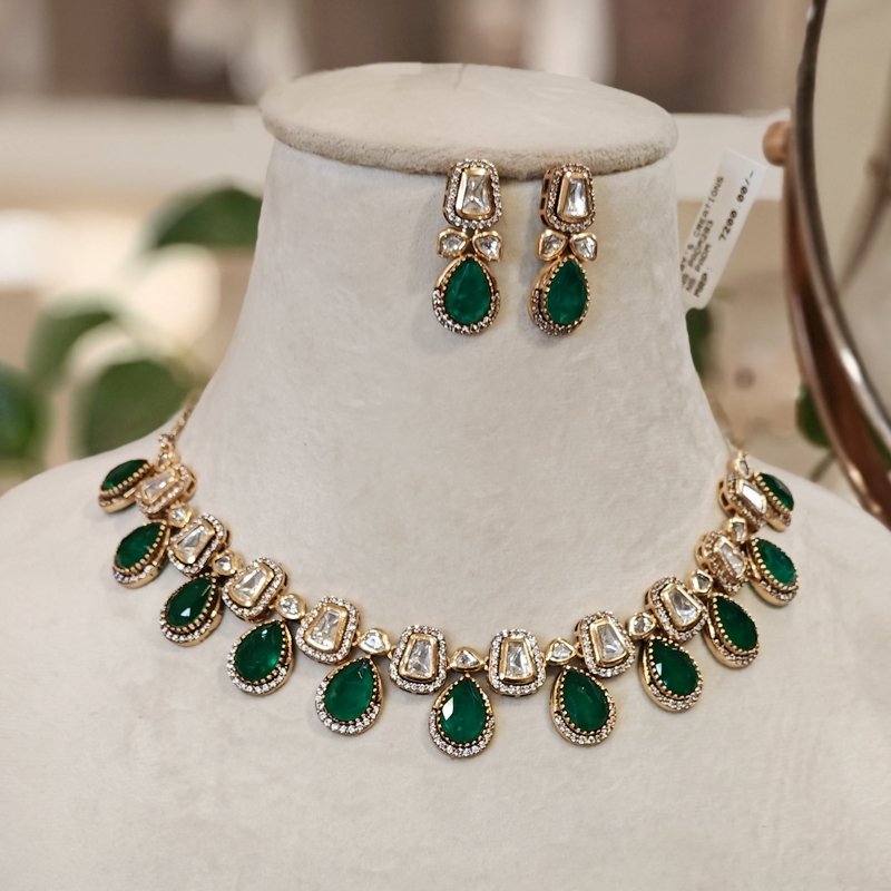 This elegant single neckline set features uncut Polki stones with emereld green stones , plated in a rich 18kt gold color. A truly sophisticated and timeless piece, perfect for adding a touch of luxury to any ensemble.