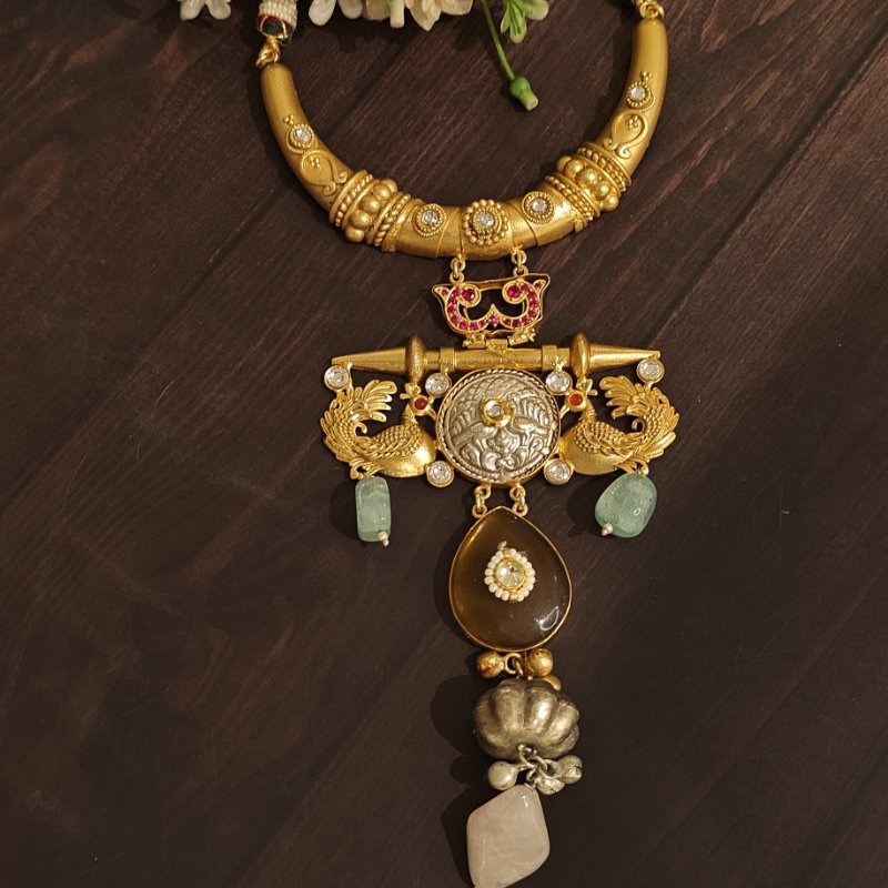 Mehak Antique look necklace set designed in hansali pattern studded with Polki gems and small red ruby stones ,beaded with yellow hydro stone with kundan tanjor work .