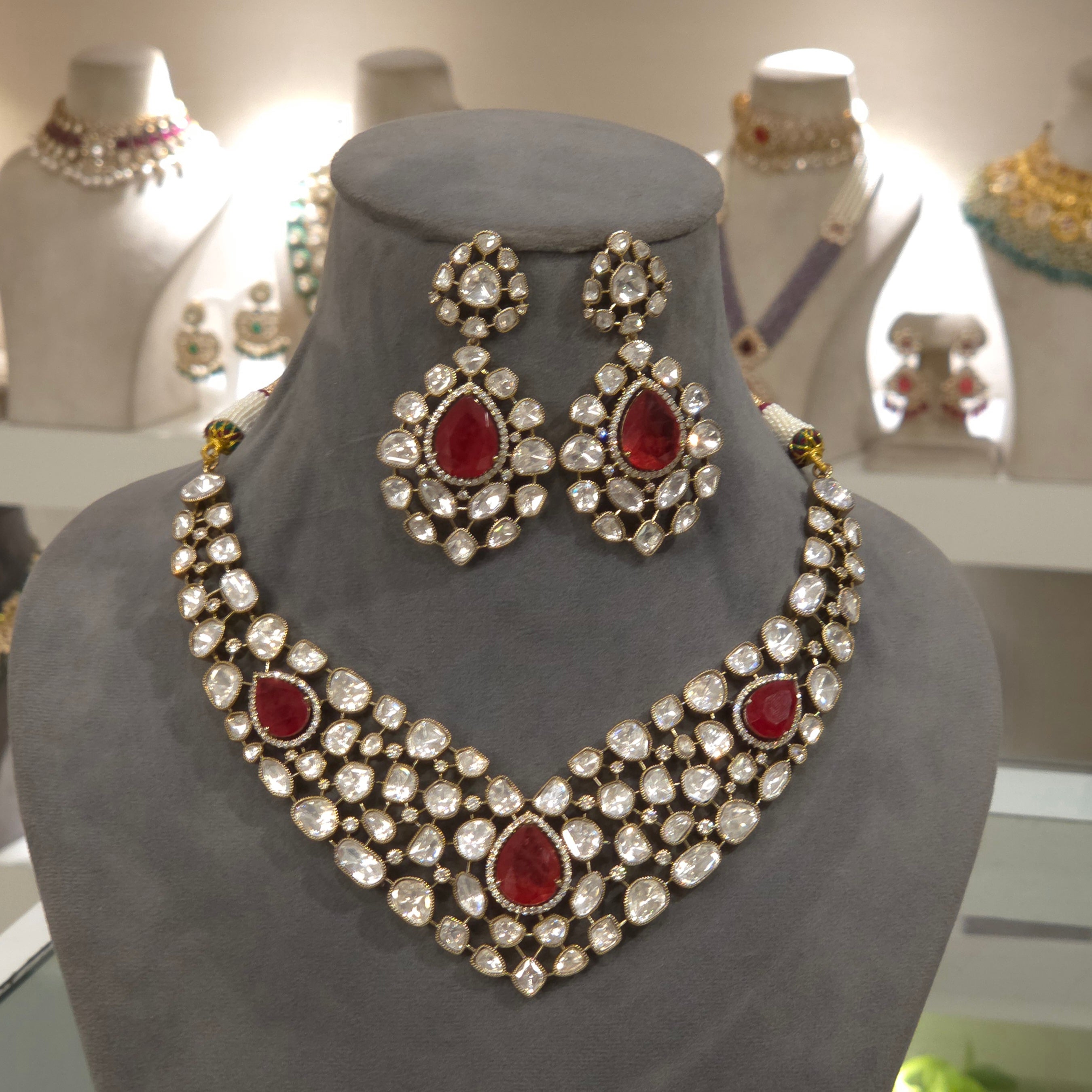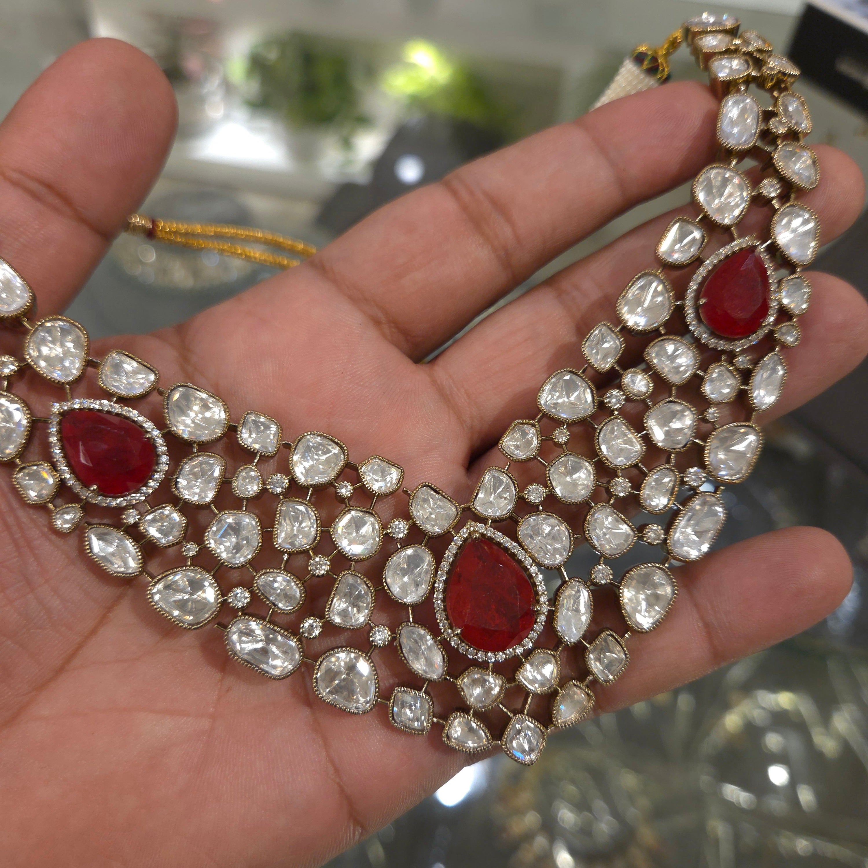 This exquisite necklace set is crafted in mixed metal alloy with vicorian mehandi plating , adorned with uncut CZ silver foil polki and doublets with natural inclusions . . 🔥🔥🔥