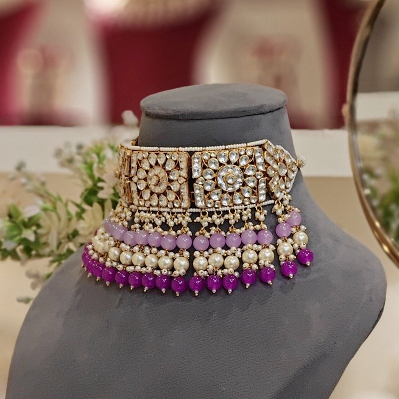 The Mehnaz choker set ,plated in 22 kt gold is embellished with the finest paachi kundan and beautifully adorned with big jhumkas. The intricate design of the piece is further accentuated with the gorgeous combination of purple and lavender beads. The set is crafted with attention to detail, and the final touch of a motif is added to give it an elegant finishing.