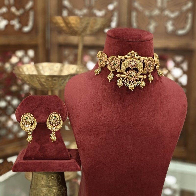 This exquisite set is part of the temple collection, featuring antique oxidized gold plating and showcasing fine craftsmanship. Its intricate design and rich detailing make it a timeless addition to any jewelry collection.