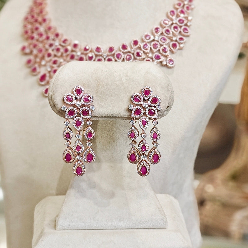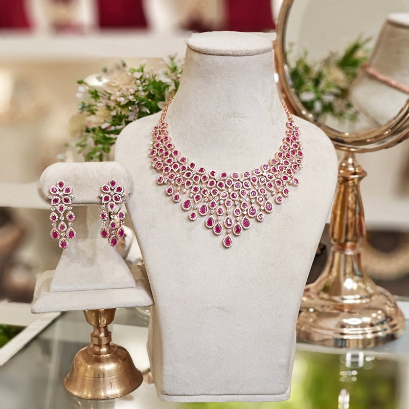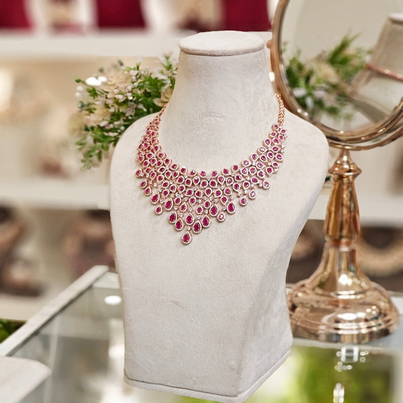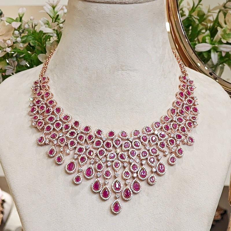 A necklace set that combines both Indian and Western influences, created with sparkly CZ stones and Ruby coloured cz stones, and finished with a rose gold plating.