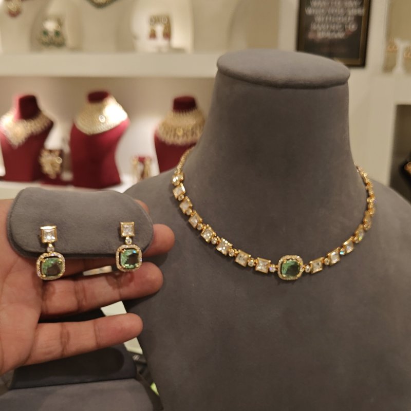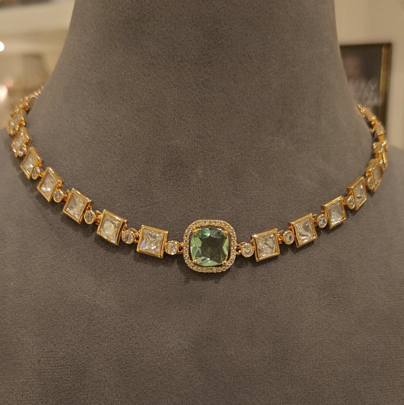 This Necklace set, adorned with Artificial unrounds polki and mint green hydro faceted stone at the center , has been coated with 18 kt gold polish. It comes with matching danglers .